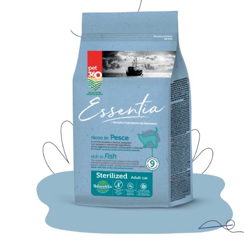 Az Essentia Sterilized Fish egy teljes értékű, gabonamentes eledel felnőtt, ivartalanított macskák számára, akik hajlamosak a súlygyarapodásra, de nem szeretnének lemondani a halas ízvilágról. A táp fő fehérjeforrásai a dehidratált lazac (26 %) és a dehidratált tonhal (23 %), melyek biológiailag értékes, könnyen emészthető fehérjéket biztosítanak.